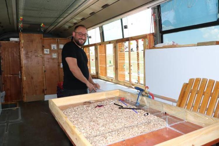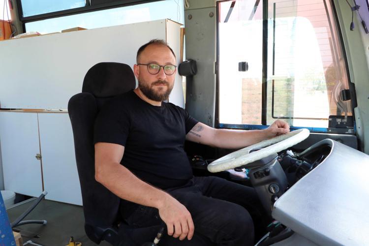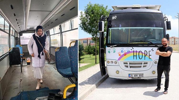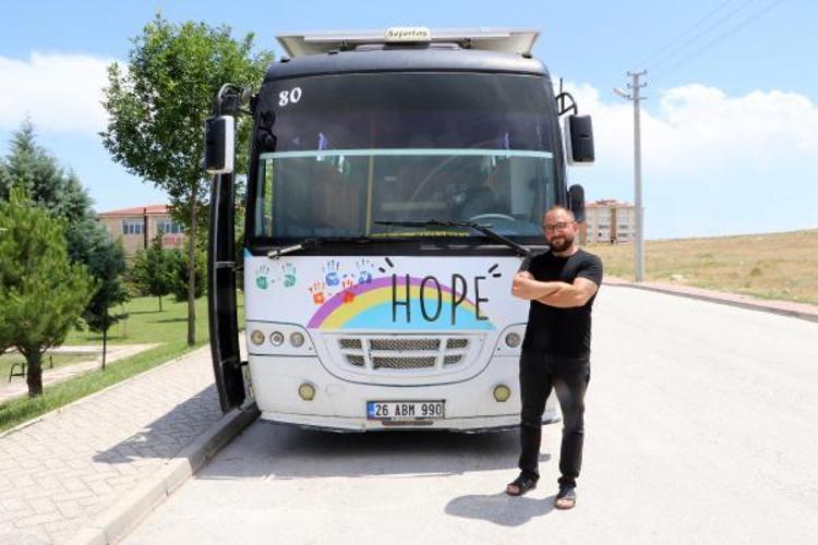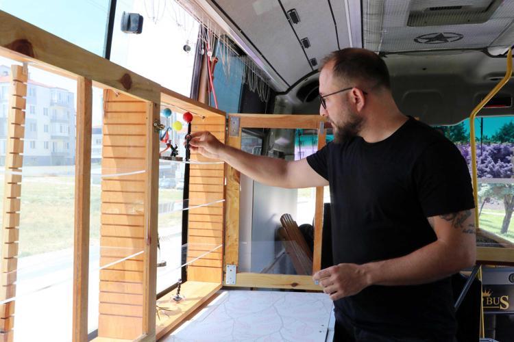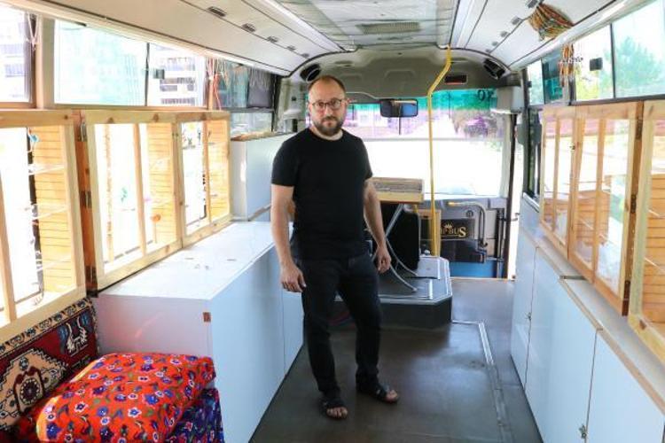 Tarihi Odunpazarı bölgesindeki atölyesinde 8 yıldır cam sanatıyla uğraşan Yasin Yüksel ve anaokulu öğretmeni, ebru sanatçısı eşi Meryem Yüksel, 8 ay önce Kocaeli'den 70 bin lira hurdaya ayrılmış halk otobüsü satın aldı.