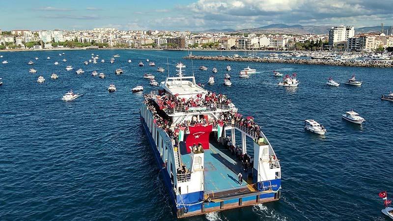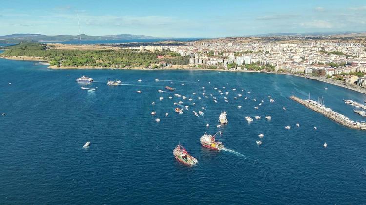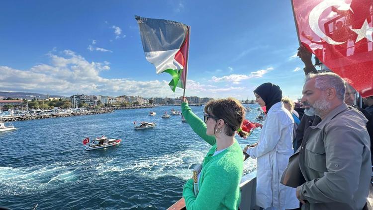 Gazze'ye insani yardım ulaştırmak amacıyla yola çıkan ve İsrail'in saldırısına uğrayan Küresel Sumud Filosu'na destek için Türk ve Filistin bayraklarıyla donatılan tekneler, denize açılarak Çanakkale Boğazı’nda tur attı.