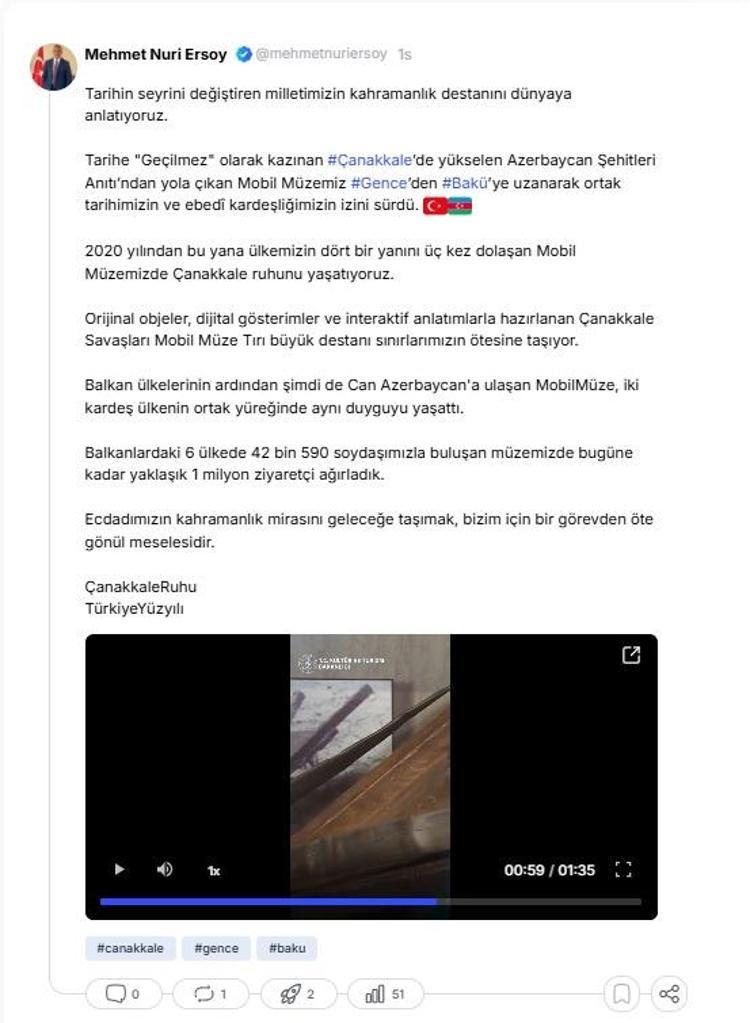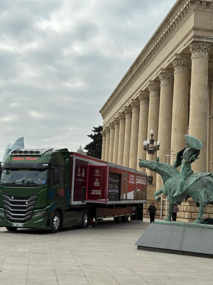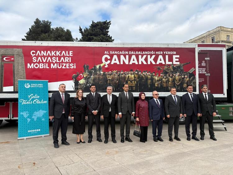 Bakan Ersoy, NSosyal hesabından yaptığı açıklamada, "Tarihin seyrini değiştiren milletimizin kahramanlık destanını dünyaya anlatıyoruz. Tarihe 'Geçilmez' olarak kazınan Çanakkale'de yükselen Azerbaycan Şehitleri Anıtı'ndan yola çıkan Mobil Müzemiz Gence'den Bakü'ye uzanarak ortak tarihimizin ve ebedi kardeşliğimizin izini sürdü. 2020 yılından bu yana ülkemizin dört bir yanını üç kez dolaşan Mobil Müzemizde Çanakkale ruhunu yaşatıyoruz. Orijinal objeler, dijital gösterimler ve interaktif anlatımlarla hazırlanan Çanakkale Savaşları Mobil Müze TIR'ı büyük destanı sınırlarımızın ötesine taşıyor" ifadelerini kullandı.