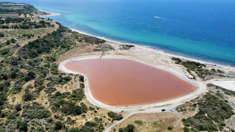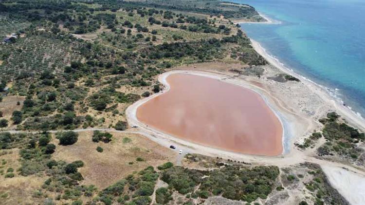 Çanakkale'nin Ezine ilçesinde yılın belli dönemlerinde pembe ve kırmızıya yakın tonlara bürünen ve kalp şekli ile dikkati çeken 'Kalpli Göl', dronla havadan görüntülendi.