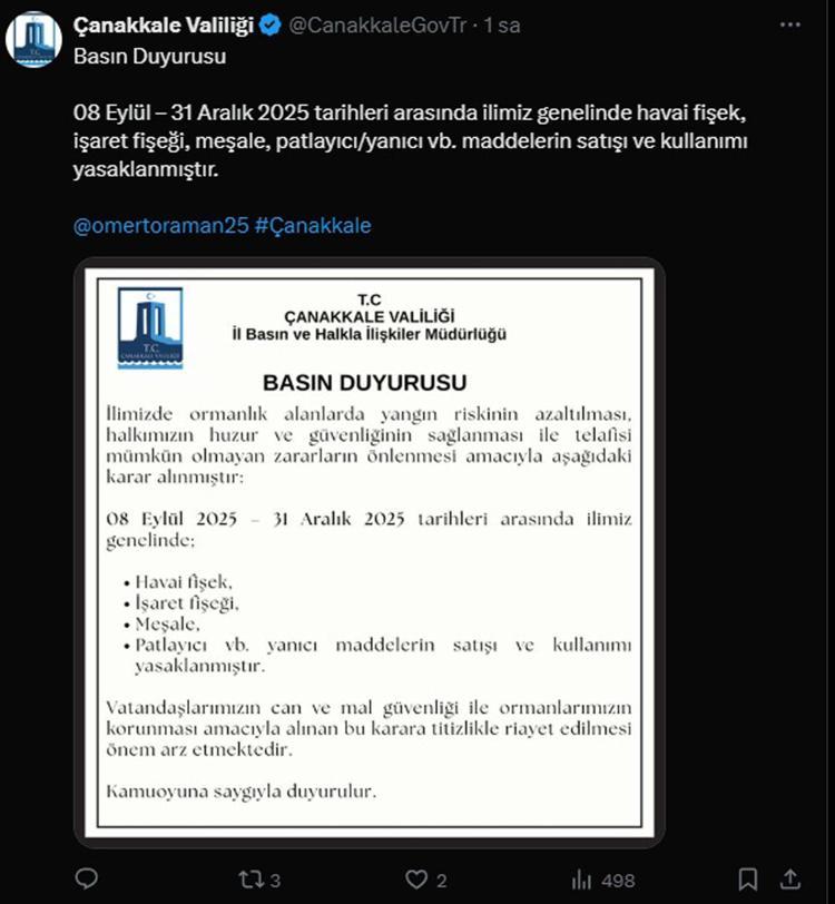 Çanakkale Valiliği’nin sosyal medya hesabında yapılan paylaşımda, "İlimizde ormanlık alanlarda yangın riskinin azaltılması, halkımızın huzur ve güvenliğinin sağlanması ile telafisi mümkün olmayan zararların önlenmesi amacıyla aşağıdaki karar alınmıştır: 08 Eylül 2025 31 Aralık 2025 tarihleri arasında ilimiz genelinde; havai fişek, işaret fişeği, meşale, patlayıcı vb. yanıcı maddelerin satışı ve kullanımı yasaklanmıştır. Vatandaşlarımızın can ve mal güvenliği ile ormanlarımızın korunması amacıyla alınan bu karara titizlikle riayet edilmesi önem arz etmektedir" denildi.