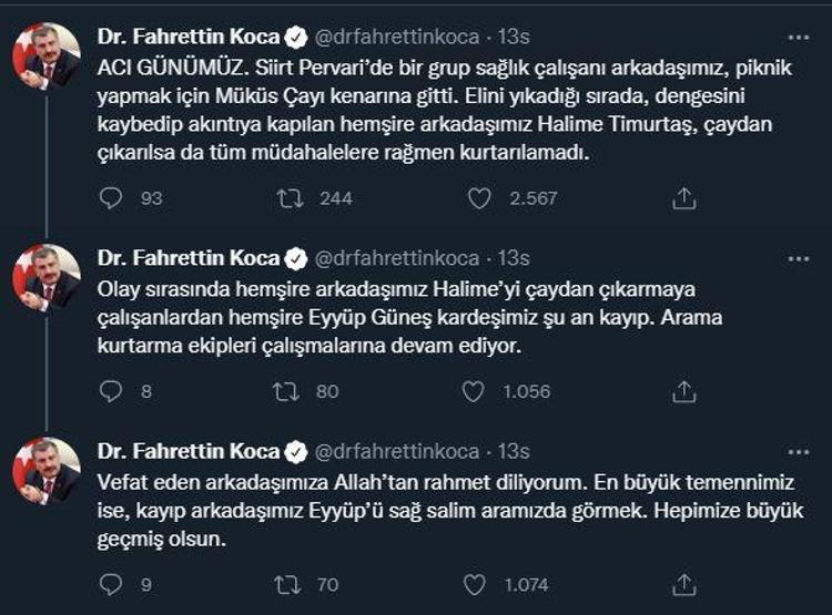 Sağlık Bakanı Fahrettin Koca da dün gece Twitter hesabında yaptığı paylaşımda, "Acı Günümüz. Siirt Pervari’de bir grup sağlık çalışanı arkadaşımız, piknik yapmak için Müküs Çayı kenarına gitti. Elini yıkadığı sırada, dengesini kaybedip akıntıya kapılan hemşire arkadaşımız Halime Timurtaş, çaydan çıkarılsa da tüm müdahalelere rağmen kurtarılamadı.