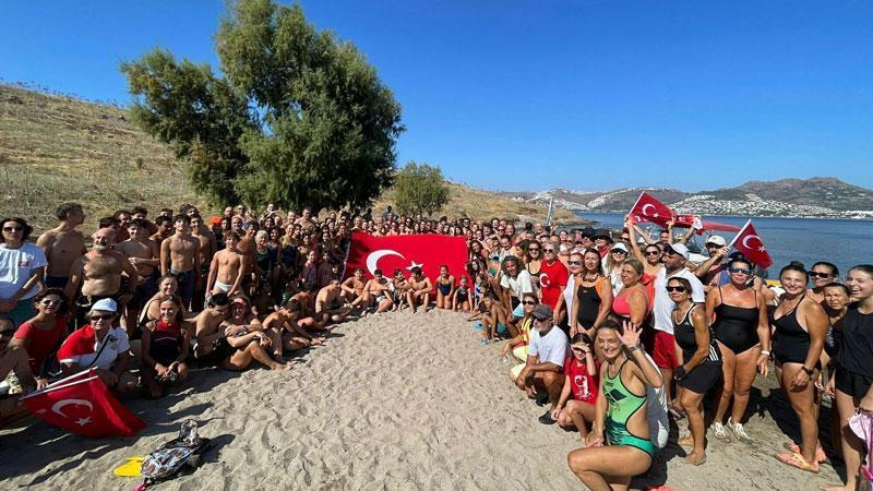 Muğla'nın Bodrum ilçesinde 30 Ağustos Zafer Bayramı kapsamında yüzlerce katılımcı, Ortakent Sahili'nden yüzerek Çelebi Adası'na ulaşıp, Türk bayrağı açtı.