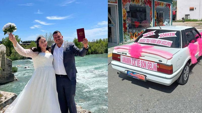 Damatlık olarak bölgeye özgü şalvar giyen Görkem ve Hafize Şahin çiftinin gelin arabasındaki yazı, görenleri gülümsetti.