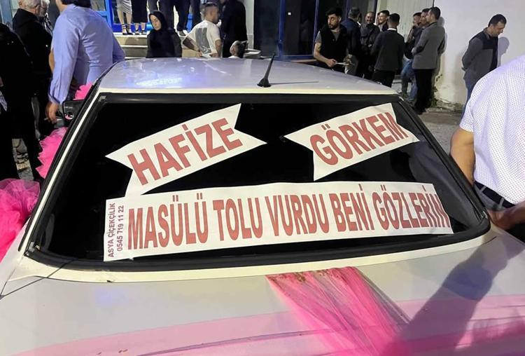 Antalya'nın Serik ilçesinde dolu nedeniyle tarım arazisi zarar gören çiftçi Görkem Şahin, dünkü düğününde gelin arabasına yöre şivesiyle 'Masülü tolu vurdu, beni gözlerin' yazısı astı.