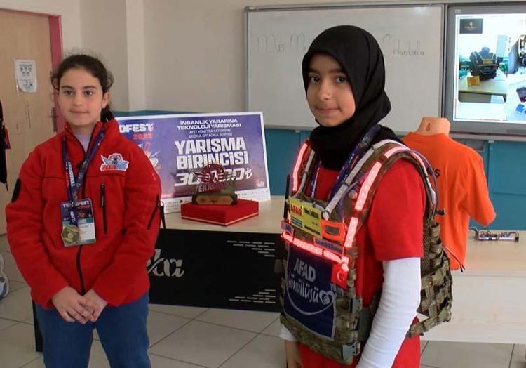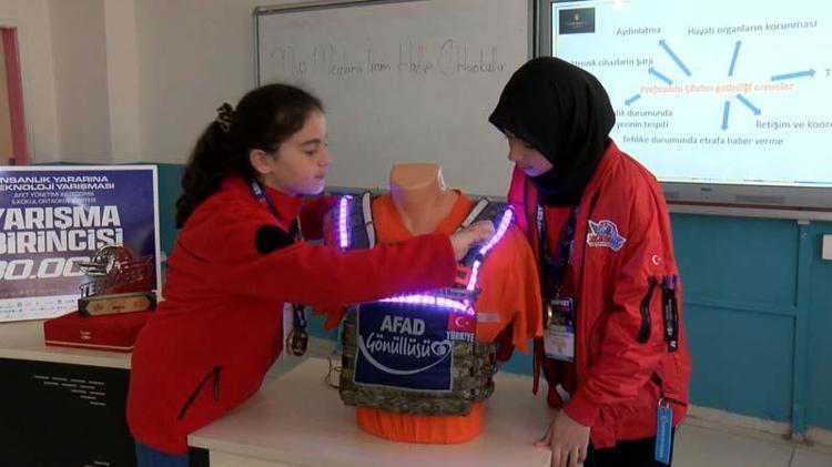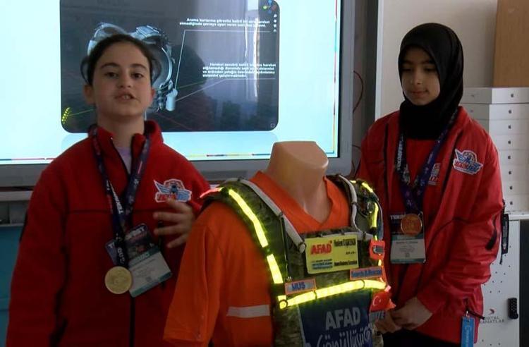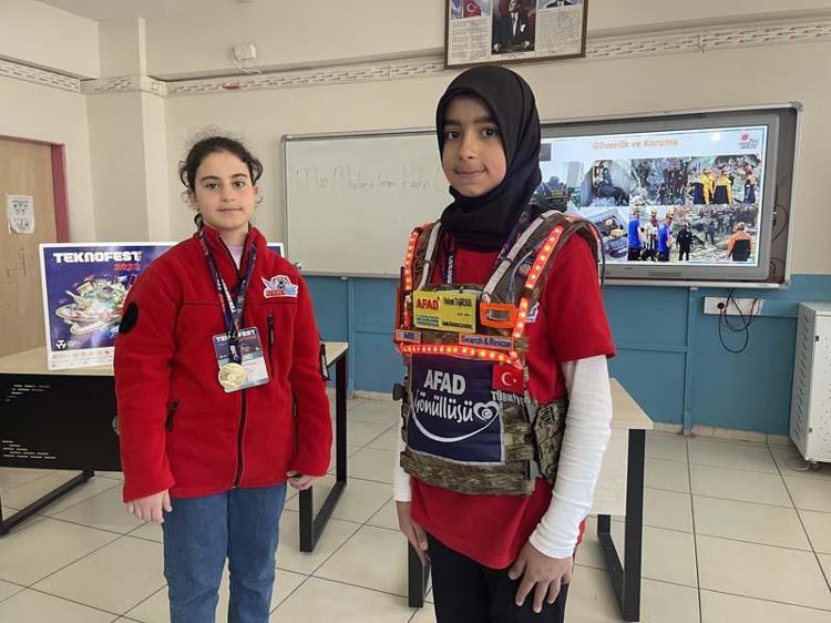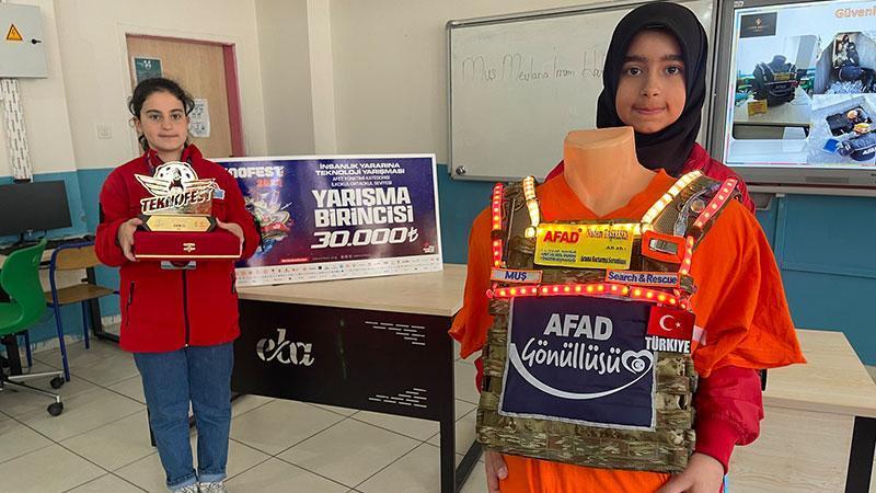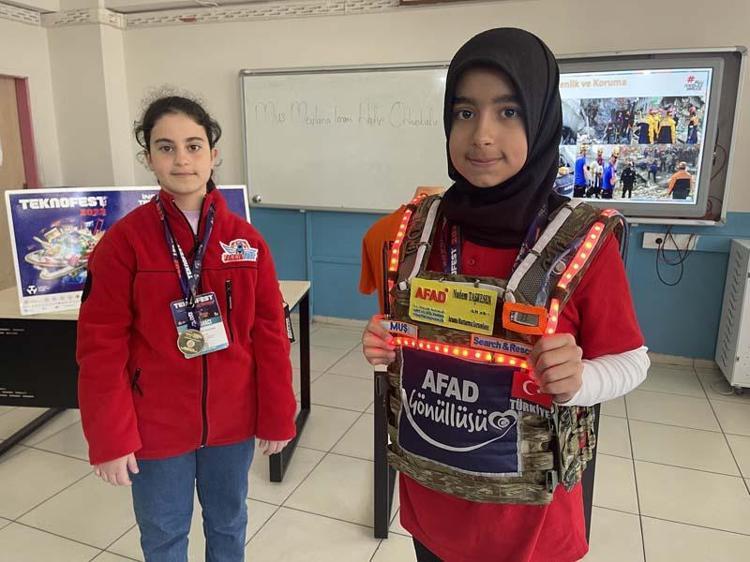 Muş'ta ortaokul öğrencileri Betül Yıldırım (12) ile Nudem Taşkesen (12), Van'ın Bahçesaray ilçesinde 2020'de yaşanan çığ faciasından etkilenip, arama-kurtarma ekipleri için 'akıllı yelek' geliştirdi. Kahramanmaraş merkezli depremlerin ardından eklemelerin yapıldığı 'akıllı yelek' projesi, Teknofest'te de 'İnsanlık Yararına Teknoloji Yarışması-Afet Yönetimi' kategorisinde Türkiye birincisi oldu. Afetlere müdahale eden ekiplerin giymesi için tasarlanan akıllı yelek, personele ilişkin bilgi veriyor. Yeleği giyen bir personelin 3 dakika hareketsiz kalması durumunda, uyarı sistemi devreye giriyor.