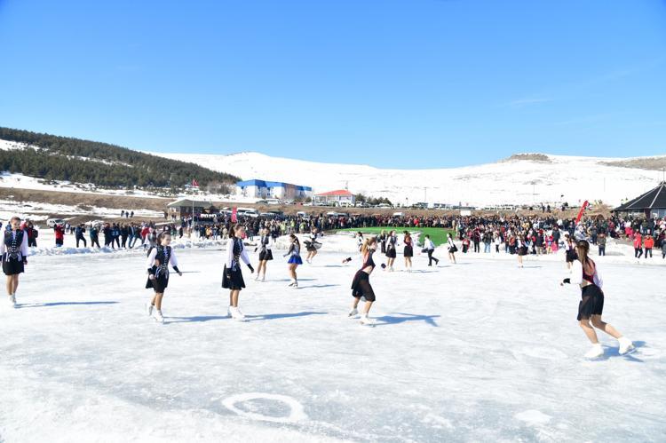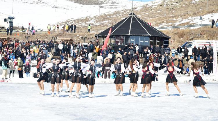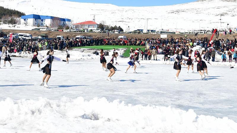 Ardahan’daki yüzeyi buzla kaplı Çıldır Gölü’nde '8 Mart Dünya Kadınlar Günü' dolayısıyla senkronize buz pateni gösterisi yapıldı.