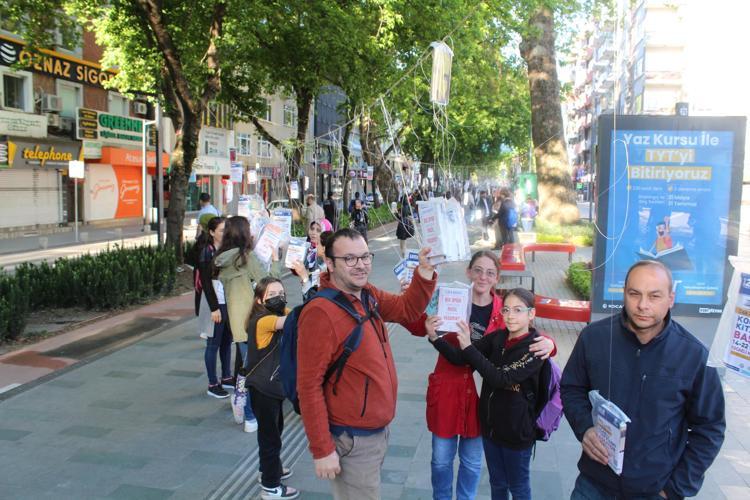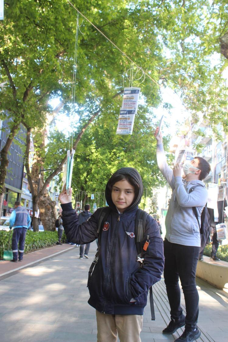 İzmit'te Kocaeli Büyükşehir Belediyesi'nce düzenlenen Kocaeli Kitap Fuarı'nın kapıları, bu yıl 12'nci kez açılacak. İzmit Cumhuriyet Bulvarı'ndaki dev çınar ağaçlarına, 14-22 Mayıs'ta düzenlenecek fuar kapsamında, itfaiye ekiplerince 5 bin kitap asıldı. İşe ya da okula gidenler, sabah saatlerinde beğendikleri kitapları ağaçlardan topladı. 5 bin kitap, dakikalar içinde ağaç dallarından indirildi. Bazı kitapseverler, yükseklere asılan kitapları ağaçlara tırmanarak aldı, bazıları ise zıplayarak ulaştı.