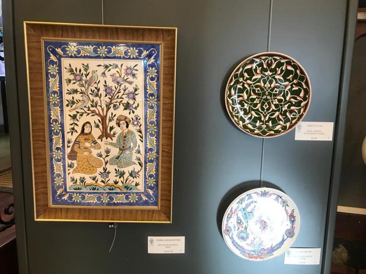 Sergide 4 eseri bulunan Pınar Demir Yontar ise “Burada iki tane saz yolu, bir tane geometrik üsluba objeler yerleştirdiğimiz ürün, bir de Levni kadınları olmak üzere toplam 4 eserim var. Dernek bizlere çok güzel bir alan açtı. Derneğin fiziki koşulları büyük çalışmalarımızı yapmamızda, tasarım oluşturmamızda çok yardımcı oldu. 24 sene bankacılık yaptıktan ve emekli olduktan sonra çini tasarımına başladım. Bambaşka bir yola girdim, bu yolda Gül Camadan çok destek oldu, iyi ki o yola kendisiyle çıktım” diye konuştu.