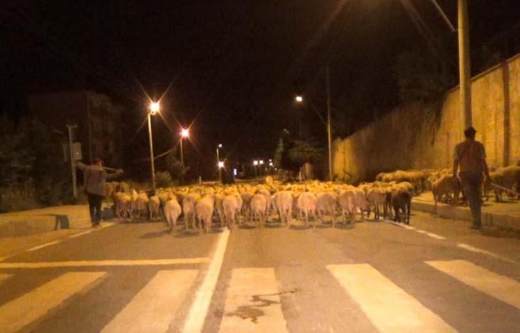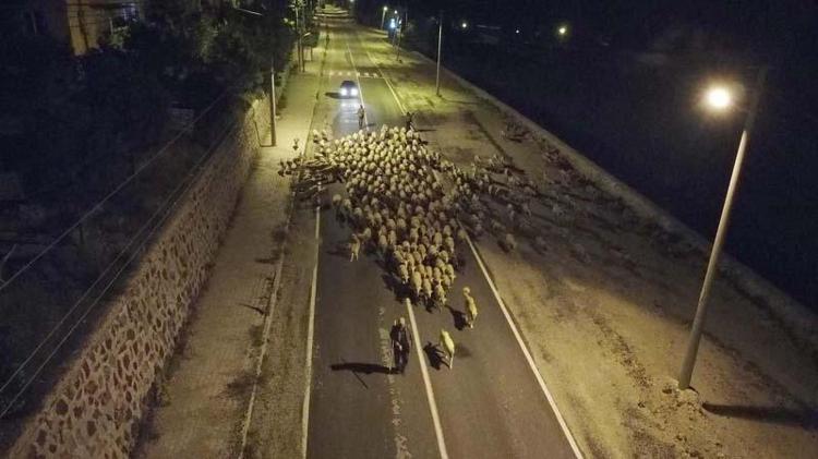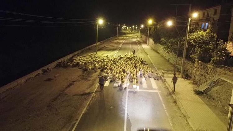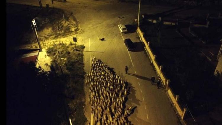 Çevre köylerden de topladığı 70’i kendisine ait 300 küçükbaşla yola çıkan Karakaya, sürüsünü 6 bin nüfuslu Şaphane'deki kara yollarından geçirdi.