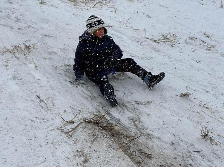 Kayseri'de kar yağışı ile birlikte çocuklar, mahallelerindeki eğimli arazide fırın tepsisi, poşet, naylon, leğen ve kızakla kayarak eğlendi.