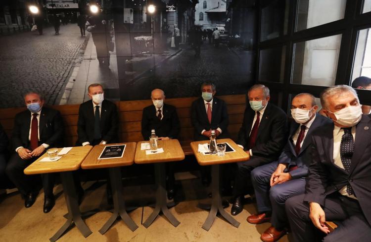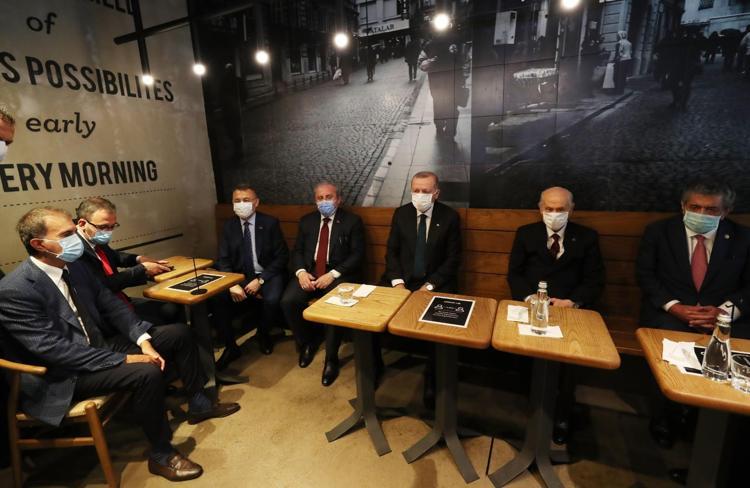 Cumhurbaşkanı Recep Tayyip Erdoğan, Fatih Sultan Mehmet'in türbesi ziyaretinin ardından Fatih Fevzi Caddesi'ndeki bir kafeye gitti. Erdoğan'a burada Cumhurbaşkanı Yardımcısı Fuat Oktay, TBMM Başkanı Mustafa Şentop, MHP Genel Başkanı Devlet Bahçeli, AK Parti Sözcüsü Ömer Çelik de eşlik etti.