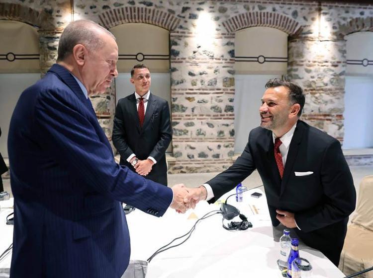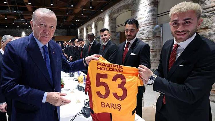 Cumhurbaşkanı Recep Tayyip Erdoğan'a sezonu gol kralı olarak tamamlayan Victor Osimhen ve Barış Alper Yılmaz formalarını hediye etti.