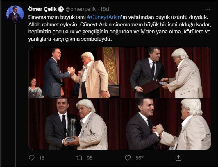 AK Parti Sözcüsü Ömer Çelik de, Twitter'deki hesabından Cüneyt Arkın ile çekilen fotoğraflarını paylaşarak, "Sinemamızın büyük ismi Cüneyt Arkın’ın vefatından büyük üzüntü duyduk. Allah rahmet eylesin. Cüneyt Arkın sinemamızın büyük bir ismi olduğu kadar, hepimizin çocukluk ve gençliğinin doğrudan ve iyiden yana olma, kötülere ve yanlışlara karşı çıkma sembolüydü.