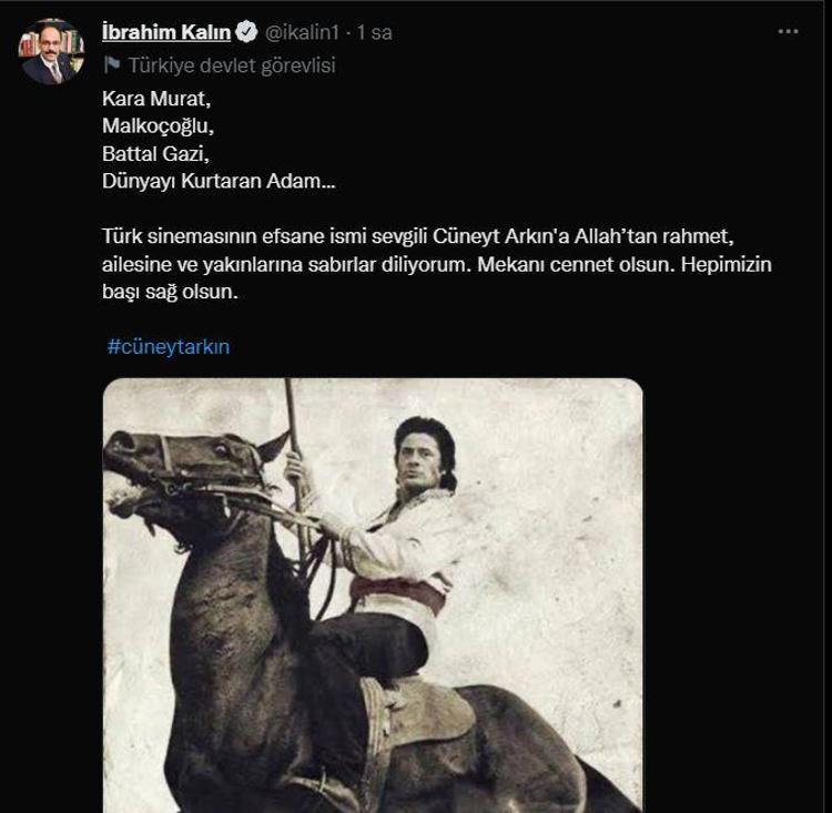 Cumhurbaşkanlığı Sözcüsü İbrahim Kalın, "Kara Murat, Malkoçoğlu, Battal Gazi, Dünyayı Kurtaran Adam, Türk sinemasının efsane ismi sevgili Cüneyt Arkın'a Allah'tan rahmet, ailesine ve yakınlarına sabırlar diliyorum. Mekanı cennet olsun. Hepimizin başı sağ olsun" ifadelerini kullandı.İletişim Başkanı Fahrettin Altun, "Türk sinemamızın usta ismi Cüneyt Arkın'ın vefatını derin bir teessürle öğrendim. Her zaman sevgi ve saygıyla yad edilecek olan kıymetli sanatçımıza Allah'tan rahmet; ailesine, sevenlerine ve sanat camiamıza başsağlığı diliyorum" dedi.
