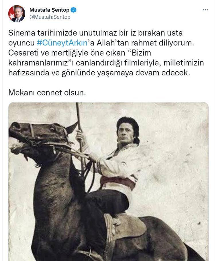 TBMM Başkanı Mustafa Şentop, Twitter hesabından yaptığı paylaşımda, "Sinema tarihimizde unutulmaz bir iz bırakan usta oyuncu Cüneyt Arkın'a Allah’tan rahmet diliyorum.