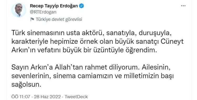 Erdoğan'ın mesajında, "Türk sinemasının usta aktörü, sanatıyla, duruşuyla, karakteriyle hepimize örnek olan büyük sanatçı Cüneyt Arkın’ın vefatını büyük bir üzüntüyle öğrendim. Sayın Arkın’a Allah’tan rahmet diliyorum. Ailesinin, sevenlerinin, sinema camiamızın ve milletimizin başı sağolsun." ifadeleri yer aldı.