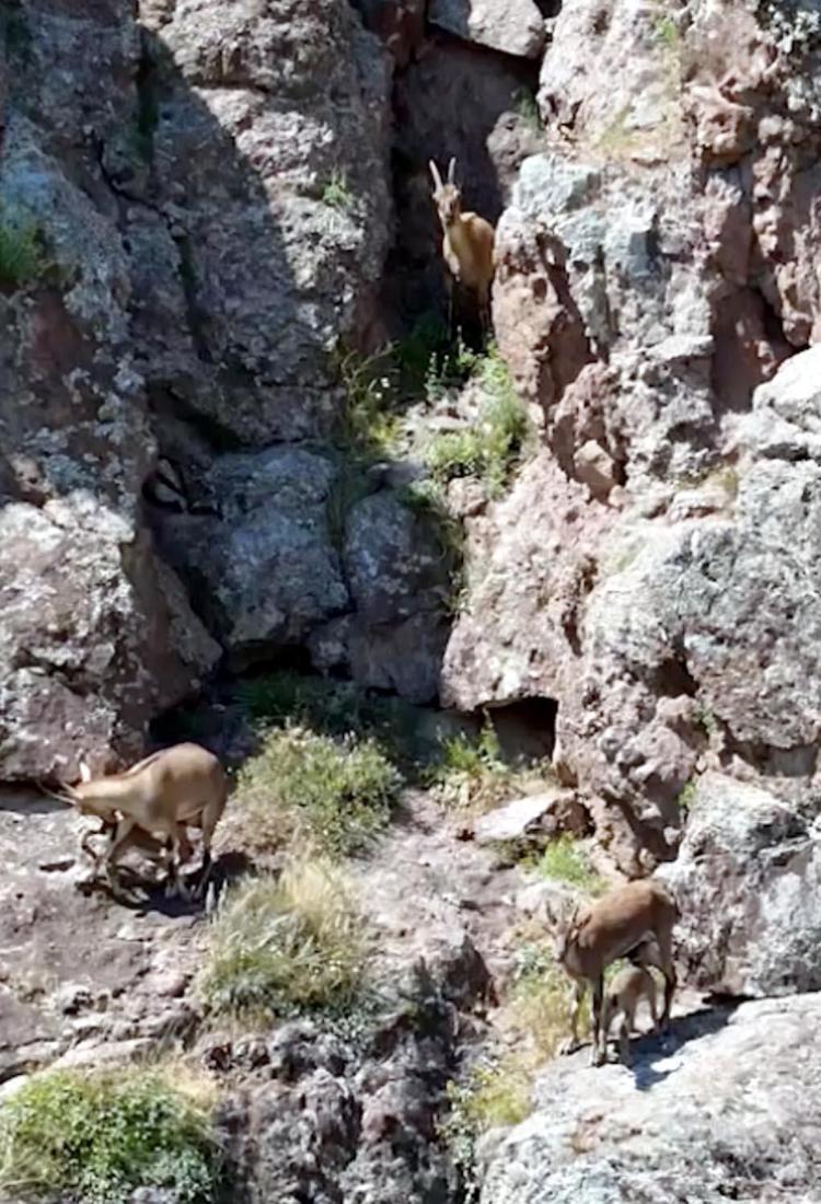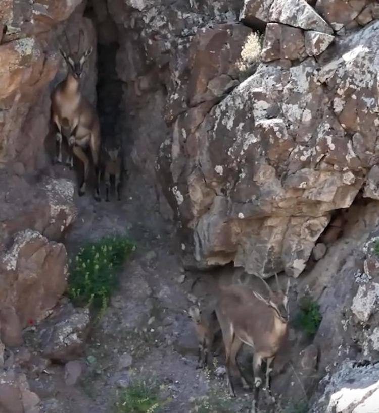 Erzincan’ın Kemah ilçesinde yavrularını emziren 2 dağ keçisi, doğa fotoğrafçısı Fatih Civan tarafından dronla görüntülendi.