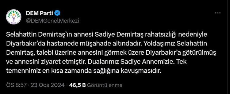 Halkların Eşitlik ve Demokrasi (DEM) Partisi'nin sosyal medya hesabından yapılan açıklamada, "Selahattin Demirtaş’ın annesi Sadiye Demirtaş rahatsızlığı nedeniyle Diyarbakır’da hastanede müşahade altındadır. Yoldaşımız Selahattin Demirtaş, talebi üzerine annesini görmek üzere Diyarbakır’a götürülmüş ve annesini ziyaret etmiştir. Dualarımız Sadiye Annemizle. Tek temennimiz en kısa zamanda sağlığına kavuşmasıdır” denildi.