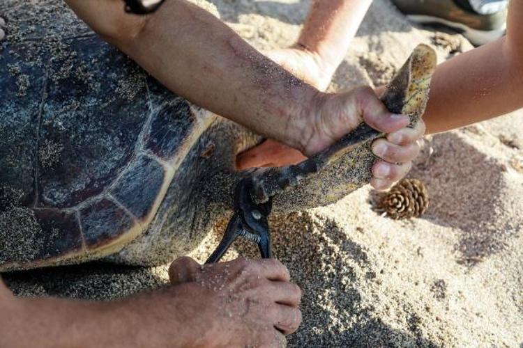 Deniz kaplumbağasını kayıt altına alan gönüllüler, üzerinde rakam yazan metal plakalığı ön kanadına tutturup denize bıraktı. Plaka sayesinde deniz kaplumbağasının nerede karaya çıktığı ve sağlık durumu takip edilebilecek.