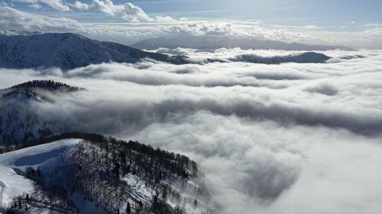 Ziyaretçilere görsel şölen sunan bulutların karlı kaplı doğayla görüntüsü dronla görüntülendi.