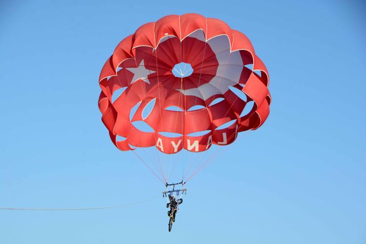 Teknenin hızlanmasıyla metrelerce yüksekliğe ulaşan Yiğit Efe Al, Türk bayrağı desenli ve üzerinde 'Alanya' yazılı paraşütle gökyüzünde süzülmeye başladı. Bisikletiyle deniz üzerinde ilerleyen sporcu, zaman zaman iskelelere ve dalgakıranlara teker koyarak kısa inişler yaptı ve ardından yeniden yükselerek gökyüzünde pedal çevirmeye devam etti. El sallayarak kendisini izleyenleri selamlayan Al, sahildeki vatandaşlar ve turistlerden alkış aldı. Gösteri boyunca kafa kamerası ve dronla çekim yapan genç sporcu, adrenalin dolu anlarını kayıt altına aldı. Görüntülerde Al'ın bisikletiyle paraşüt altında denge kurduğu, gökyüzünde bisiklet sürüyormuş gibi süzüldüğü anlar dikkati çekti.