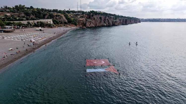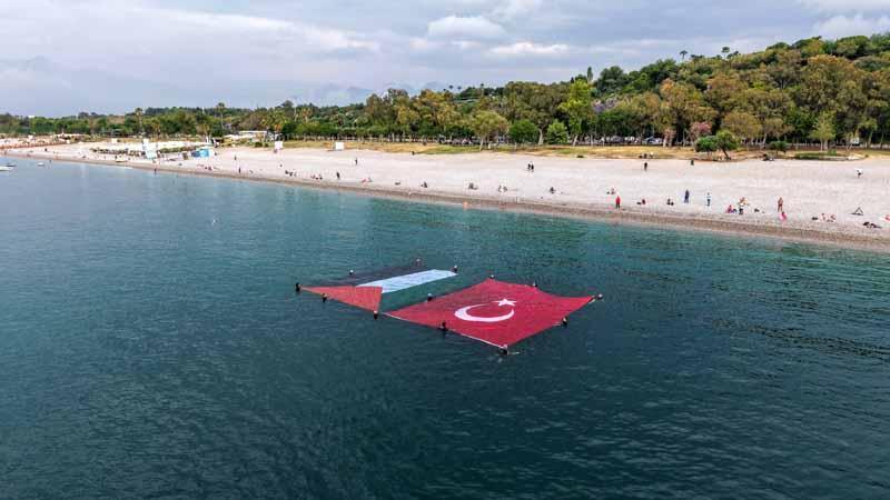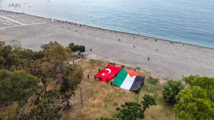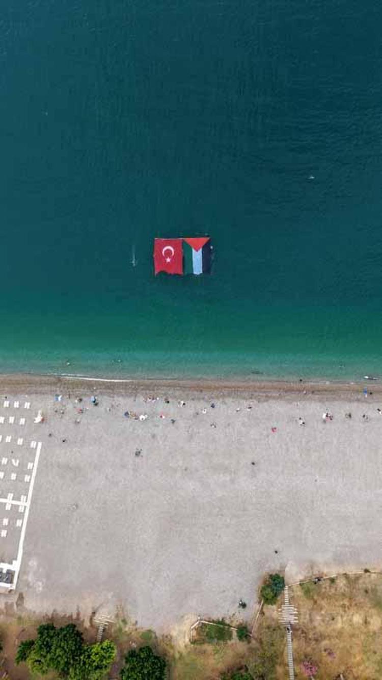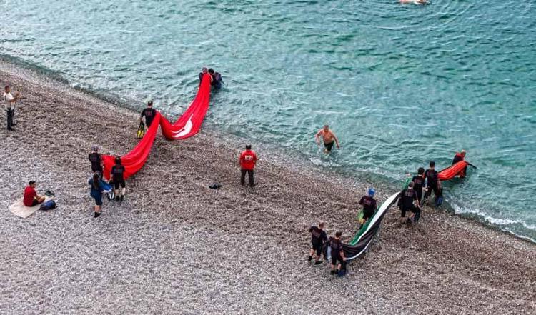 Konyaaltı Sahili'nde bir araya gelen dernek üyeleri, denizde Türk ve Filistin bayrakları açtı. Sahildekilerin ilgili bakışları arasında bayrakları denizde açan İHH üyeleri, sloganlar atarak, Filistin'e destek mesajları verdi.
