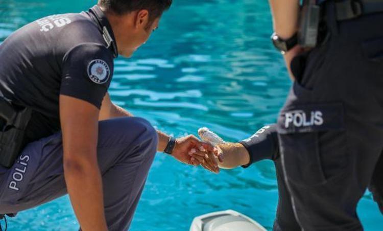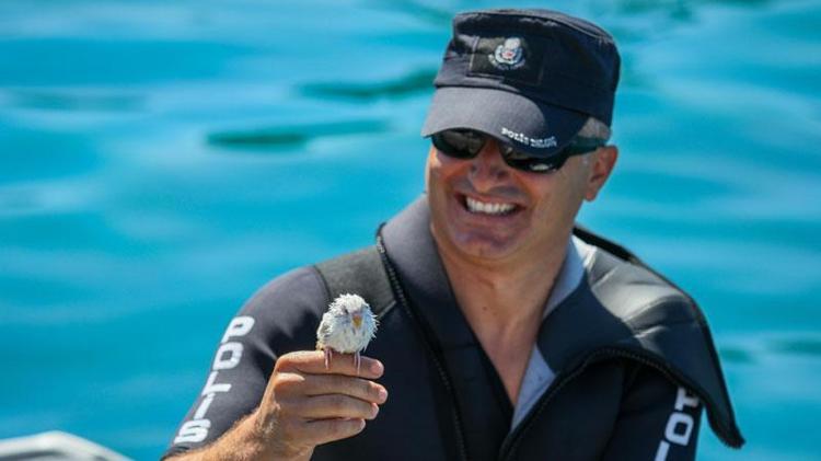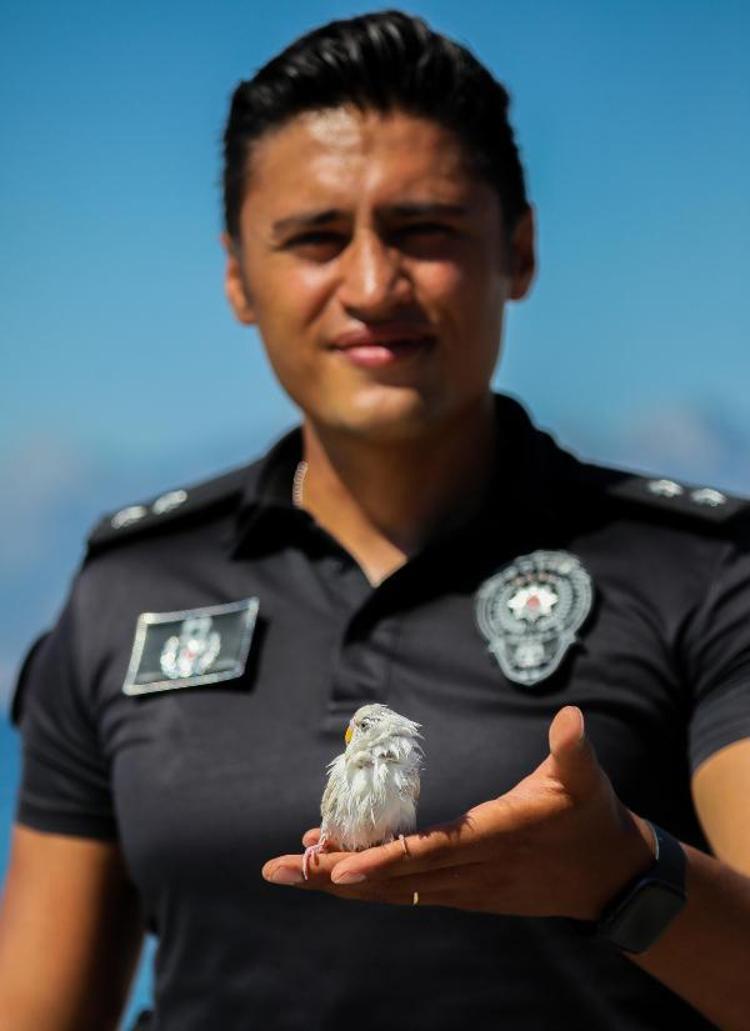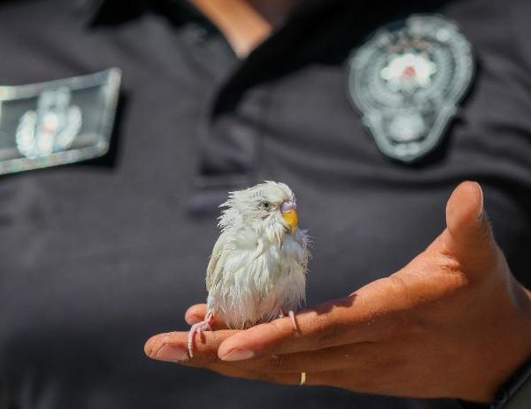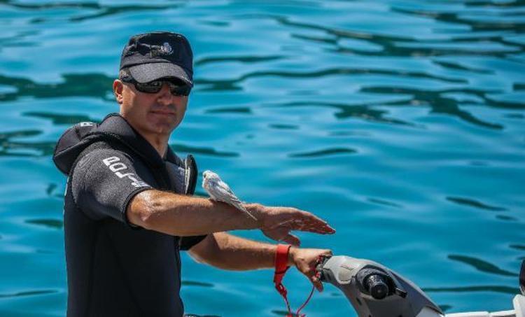 İl Emniyet Müdürlüğü Deniz Liman Şube Müdürlüğü'nde görevli deniz olaylarına hızlı müdahale timinden jet-ski kullanıcısı deniz polisi Hüseyin Ertaş, suya düşen muhabbet kuşunu boğulmaktan son anda kurtardı.