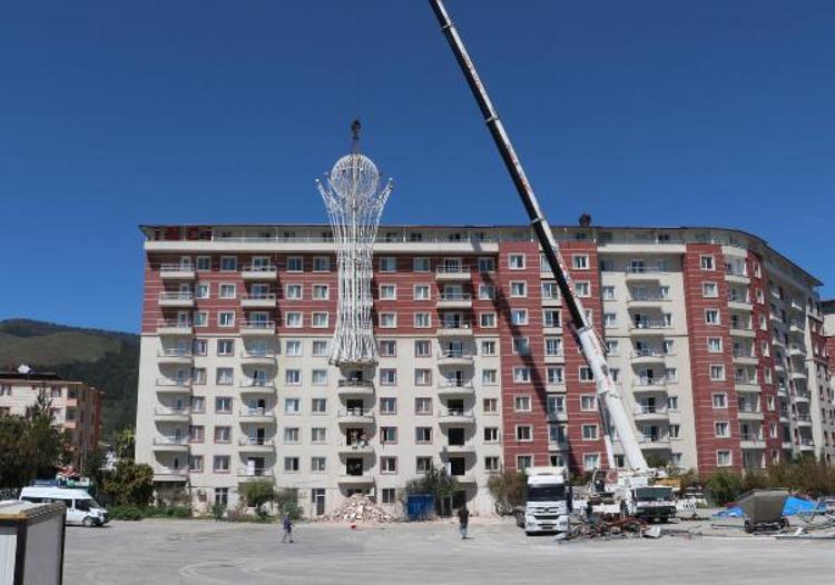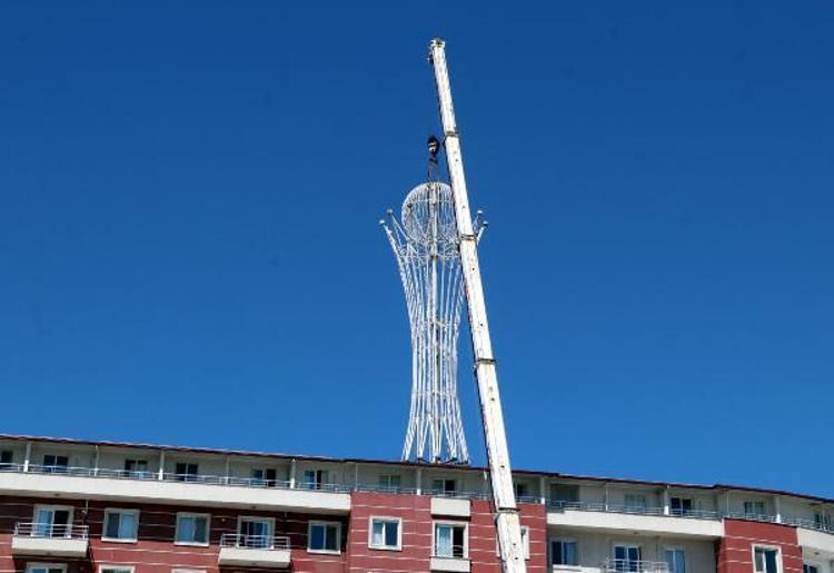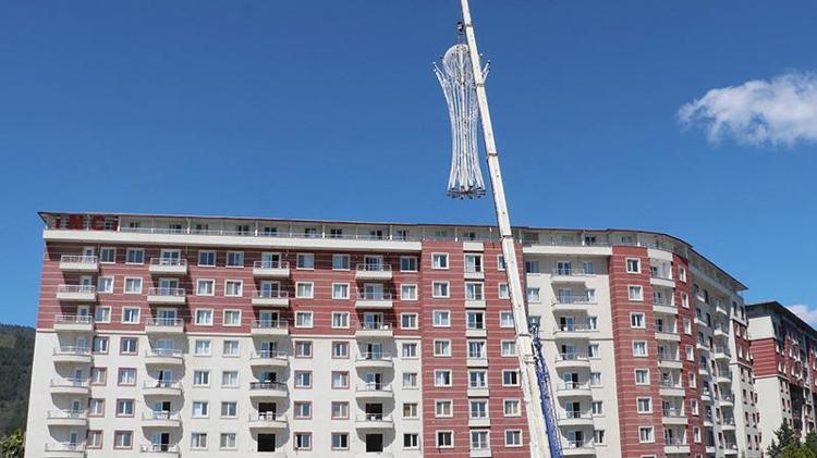Depremde az hasar alan sitenin tepesindeki 5 tonluk demir paratoner, vinçle söküldü