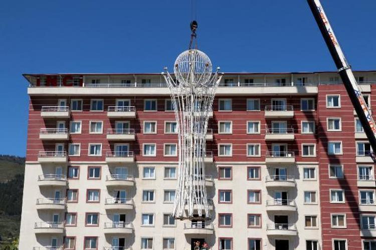 Hatay'da depremde az hasar gören yaklaşık 2 bin kişinin ikamet ettiği İnci Sitesi’nin tepesindeki 5 ton ağırlığında ve 25 metre uzunluğundaki demir paratoner, devrilme ihtimaline karşın vinçle sökülüp indirildi.
