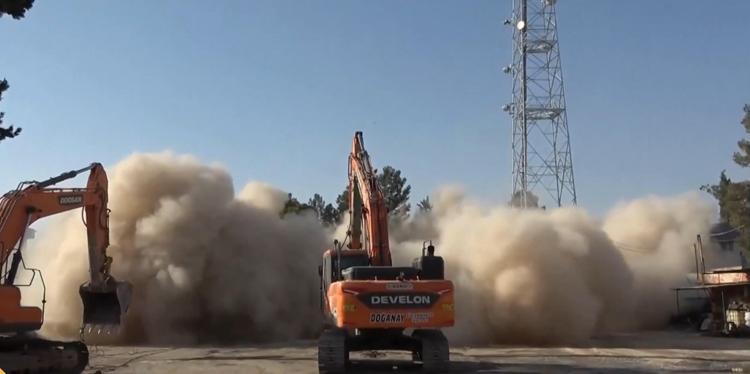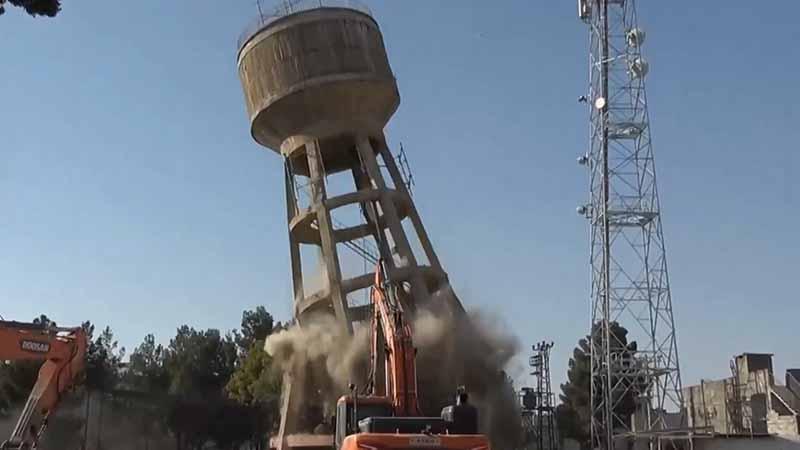 Belediye garajında bulunan su kulesinin yıkımı için güvenlik önlemleri alındıktan sonra iş makinesiyle çalışma başlatıldı. İş makinesinin müdahalesinin ardından su kulesi kontrollü olarak yıkıldı. Yıkım sırasında etraf ise toz bulutu ile kaplandı.