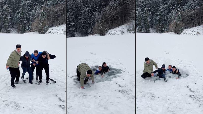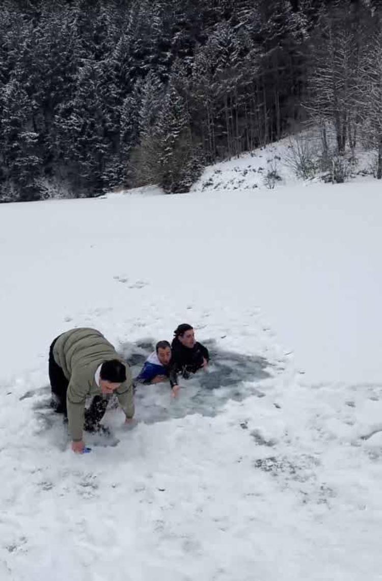 Derenin üzerinde zıplarken buz kırılınca suya düştüler; o anlar kamerada