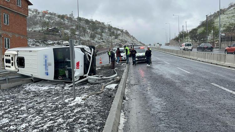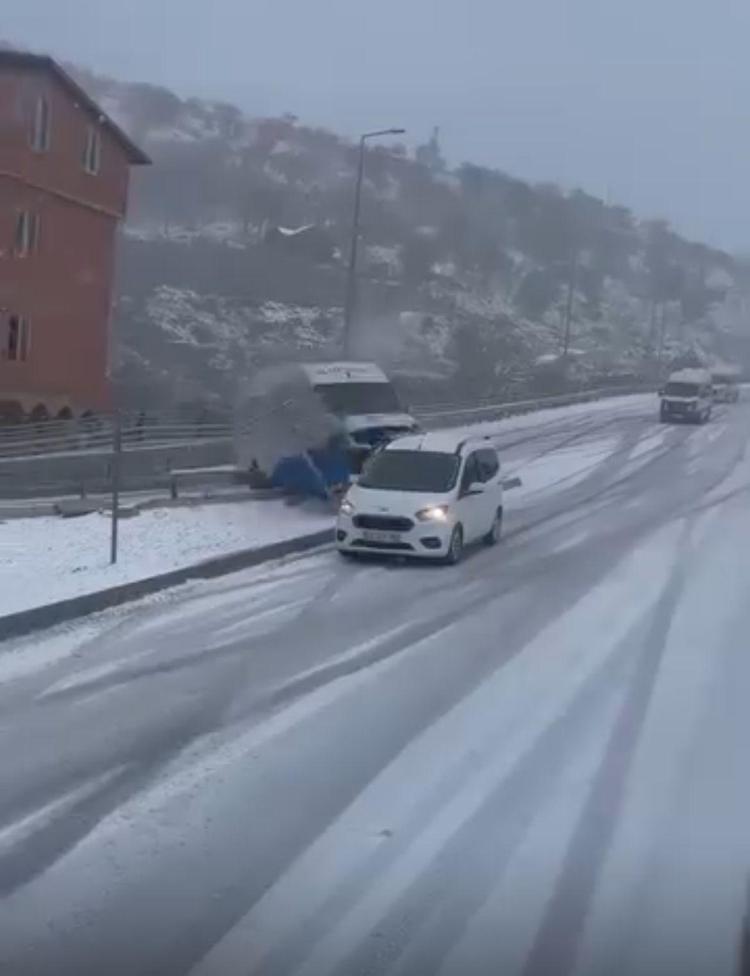 Öte yandan, kaza bölgeden geçen bir kişi tarafından cep telefonuyla görüntülendi. Görüntülerde, servis minibüsünün kayganlaşan yolda bir süre ilerlediği ardından da yönlendirme levhalarına çarparak devrildiği görüldü. Aynı yönde ilerleyen otomobilin de önce devrilen minibüse ardından da refüje çıktığı görüntülerde yer aldı.