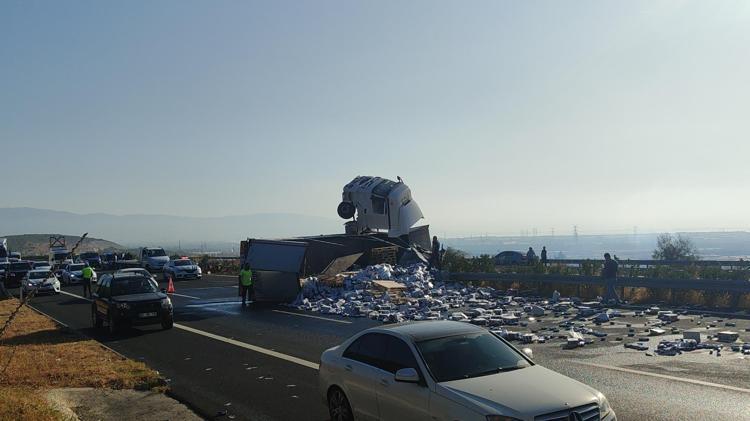Bursa'nın Orhangazi ilçesinde TIR, bariyerlere çarpıp devrildi. Kazada, TIR'ın dorsesinde yüklü yaklaşık 25 ton enerji içeceği kolileri yola saçıldı.