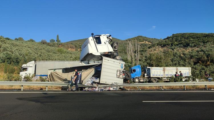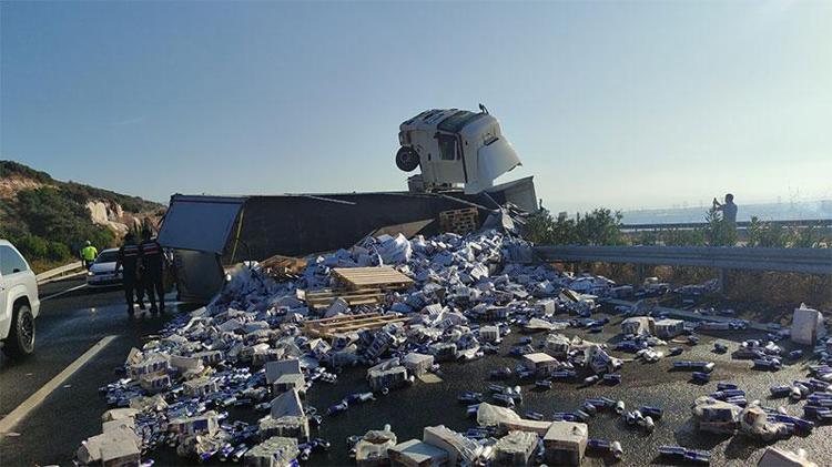 Devrilip sürüklenen TIR, refüjdeki bariyerlere çarpıp durdu. Kazada, TIR’ın dorsesinde yüklü yaklaşık 25 ton enerji içeceği kolileri yola savruldu.