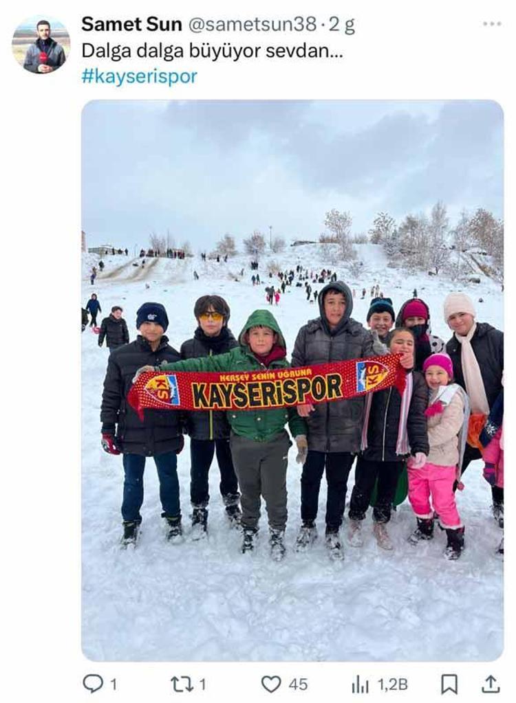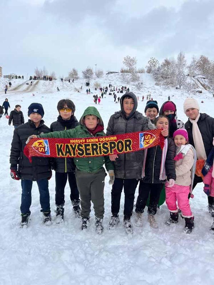 Kayseri’de Çarşamba günü başlayan ve kent genelinde 2 gün okulların tatil edildiği kar yağışı sonrası Talas ilçesinde poşet, leğen ve tepsilerle kayan çocukların arasında Kayserispor atkısı ile kayak yapan Mahmut Çağrı ve Ömer Tuğrul Özocak kardeşlerin sarı-kırmızılı takımın atkısını tutarak verdikleri pozu DHA muhabiri Samed Aydın Sun sosyal medya hesabından paylaştı.