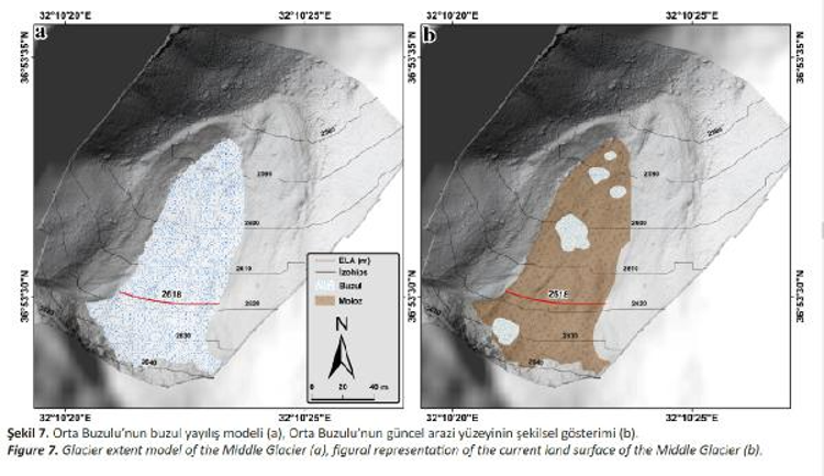 Bu çalışma aynı zamanda bilimsel olarak Geyik Dağı’nda güncel bir buzulun varlığını tanımlayan ve doğrulayan bu türde bir ilk çalışmadır. SBM (Son Buzul Çağı) buzul yayılışı sırasında 13 kilometrekare, 2010 yılındaki uydu görüntülerine göre belirlenen buzul yüzey alanının ise 44 bin 500 metrekare olduğu hesaplanmıştır. Bu bağlamda Son Buzul Çağı dönemindeki toplam buzul alanının yalnızca 0,06’sı günümüze kadar kalabilmiştir.