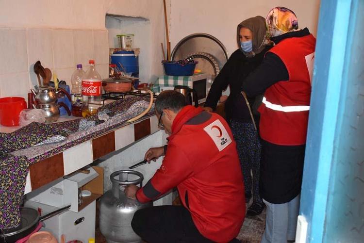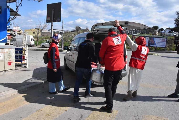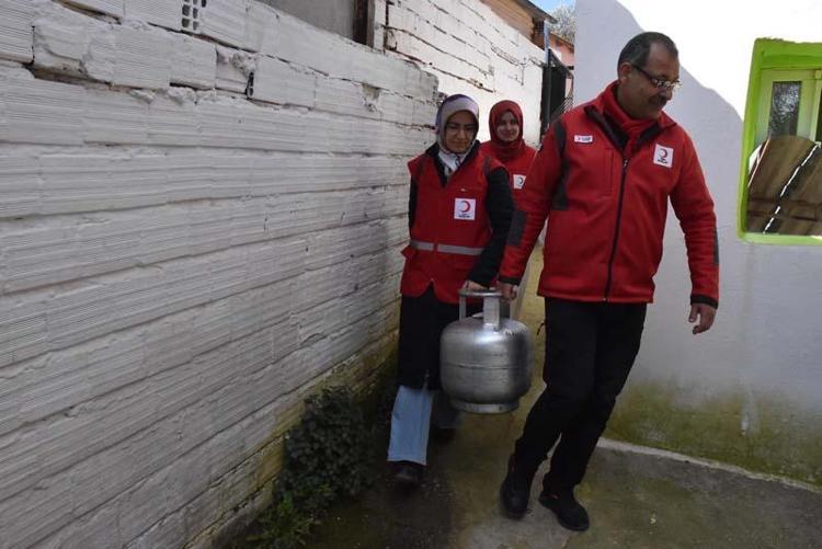 Telefonla arayarak ihtiyaçlarını soran Kızılay gönüllüsü Raziye Tuba Eren'e (36) eksiklerini söyleyen Yalçın, kapısına getirilen mutfak tüpüyle büyük mutluluk yaşadı.
