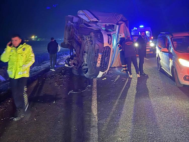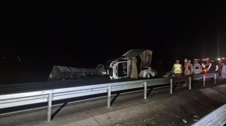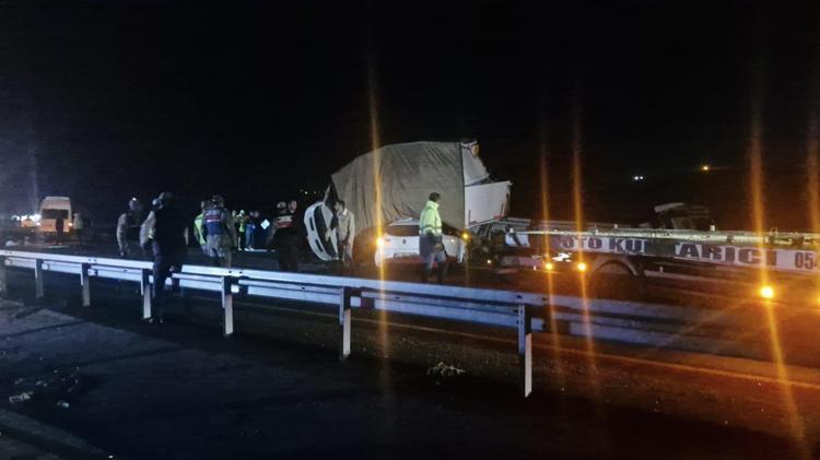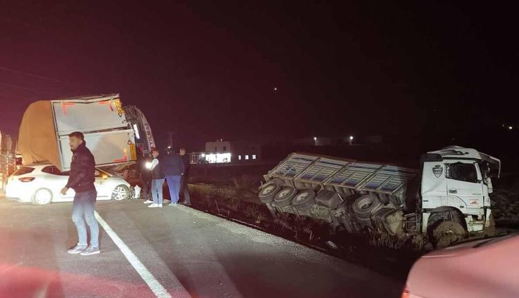 Zincirleme kazanın ardından TIR, tarlaya devrilirken kamyonet bir otomobilin üzerine yan yattı. İhbar üzerine bölgeye AFAD, sağlık, itfaiye, polis ve jandarma ekipleri sevk edildi.