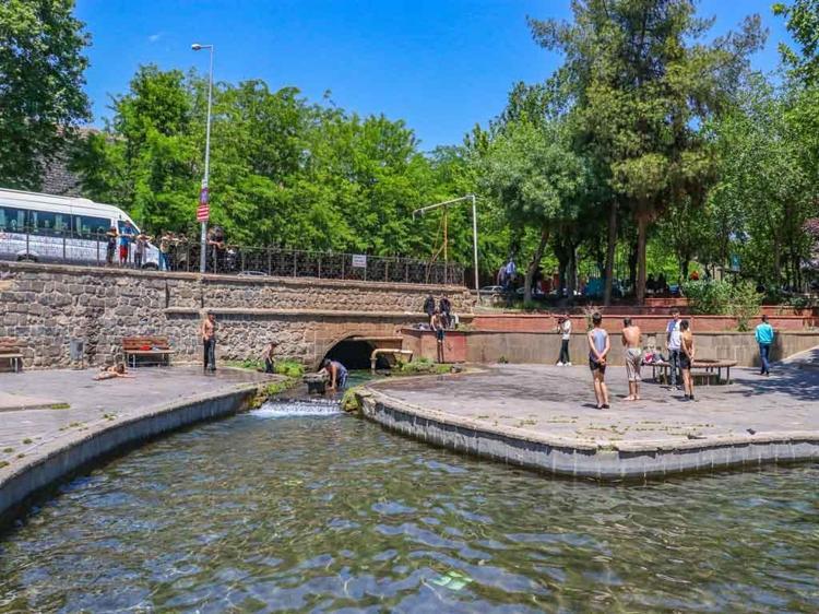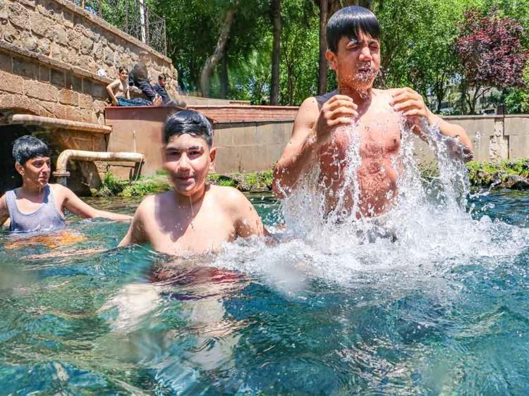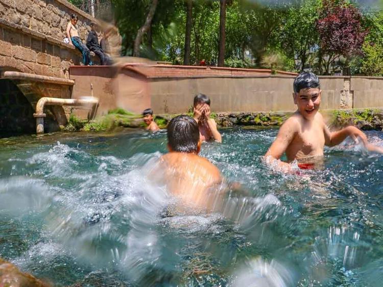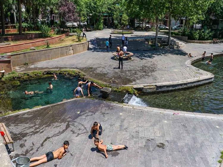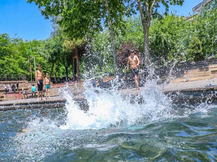 Sur ilçesi Melikahmet Mahallesi'ndeki tarihi Anzele Parkı'nda bulunan süs havuzu, havaların ısınmasıyla birlikte yine çocukların, oyun ve yüzme alanına döndü.