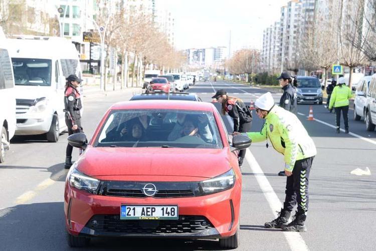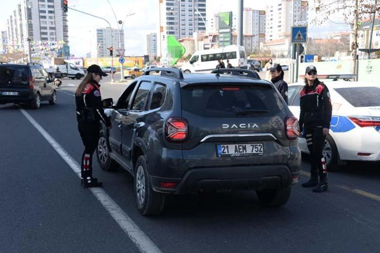 Kayapınar ilçesi Fırat Bulvarı'ndaki trafik denetiminde kadın çevik kuvvet polisleri, çevre güvenliği alırken, diğer kadın polisler de denetim yaptı.