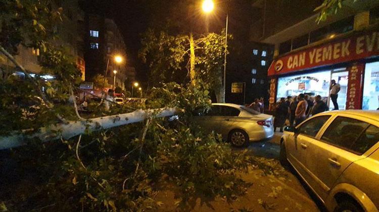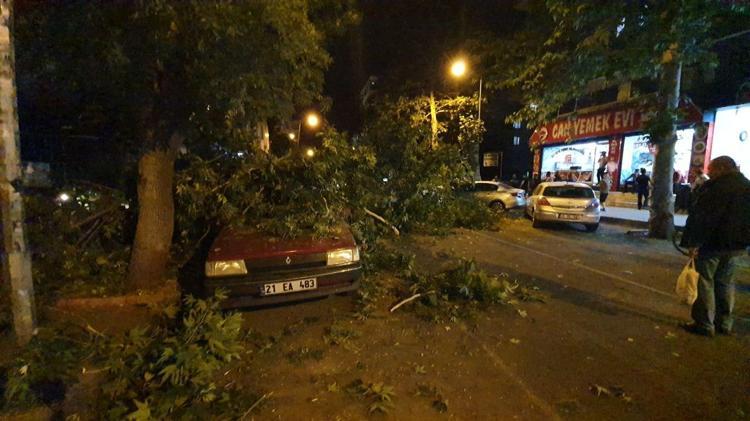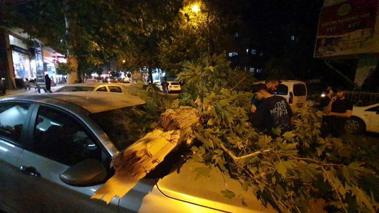 Diyarbakır'da kuvvetli rüzgar nedeniyle devrilen ağaç, park halindeki 3 aracın üzerine düştü. Araçlarda hasar oluştu.