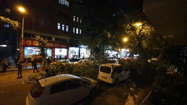 Cadde üzerindeki bir ağaç, kuvvetli rüzgar nedeniyle gövdesinden kırılarak park halindeki araçların üzerine düştü.