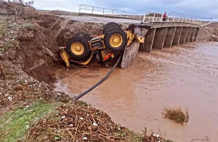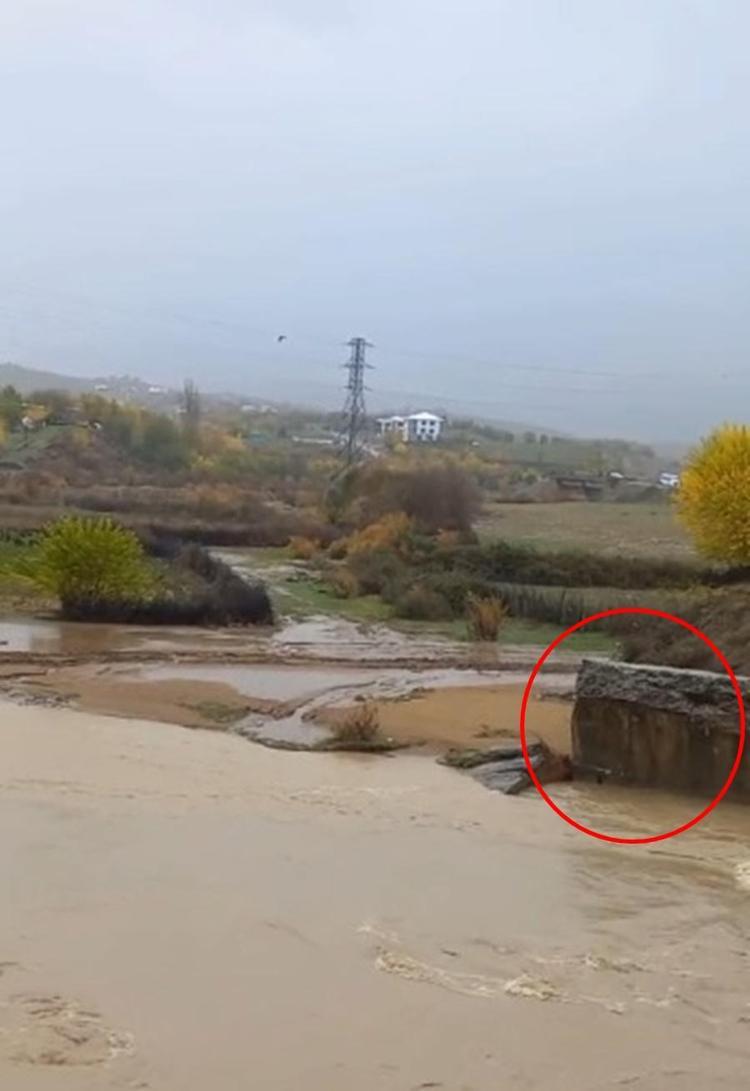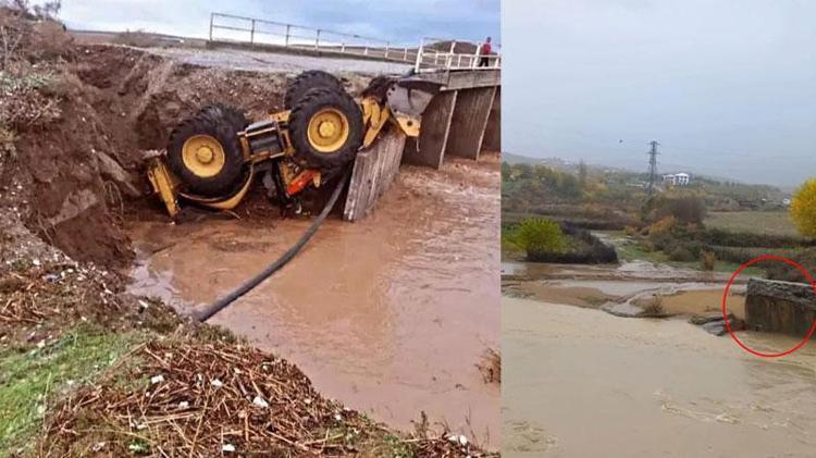 Kırsal Ali Bey Mahallesi ile Çeltik Mahallesi arasında bulunan ve sağanak nedeniyle hasar alan köprüde çalışma yapan iş makinesi, dere yatağına düştü.
