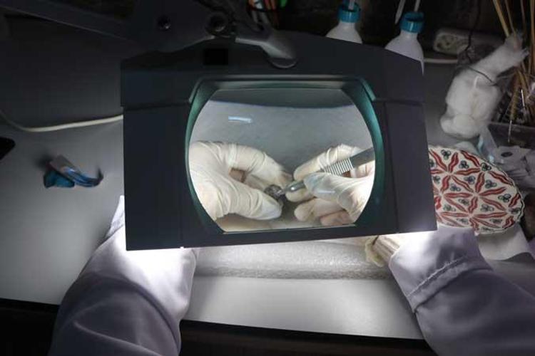 Bronz, demir, kemik ve tekstil eserler için ayrı ayrı işlemler yapıyoruz. Eserleri elimize aldığımızda ilk olarak eser üzerindeki korozyon tabakalarına bakıyoruz. Bu tabakaları tespit ettikten sonra temizlik aşamaları için kararlar alıyoruz. Ondan sonra uygulama aşamasına geçiyoruz.