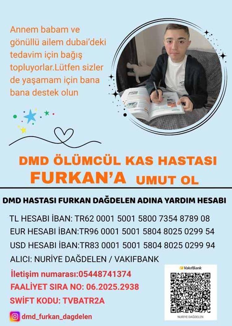 Ankara'da 2 yaşındayken Duchenne Musküler Distrofi (DMD) teşhisi konulan Furkan Dağdelen'in (15), 3 milyon dolarlık tedavi masrafı için valilik onaylı yardım kampanyası başlatıldı.