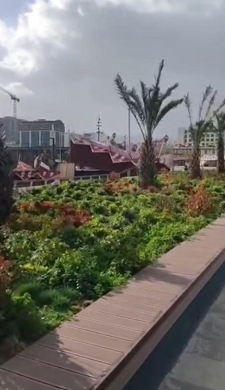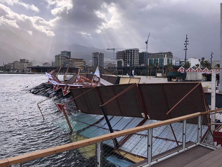 Hatay'ın İskenderun ilçesinde etkili olan fırtına nedeniyle Atatürk Anıt Alanı'nda ramazan ayı için kurulan yöresel pazar alanındaki stantlar zarar gördü.