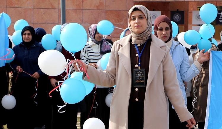 Erzurum’da Atatürk Üniversitesi İlahiyat Fakültesi Yeni Eksen Öğrenci Kulübü, Doğu Türkistan'da yaşanan zulme dikkat çekmek için gökyüzüne mavi ve beyaz balonları bıraktı.