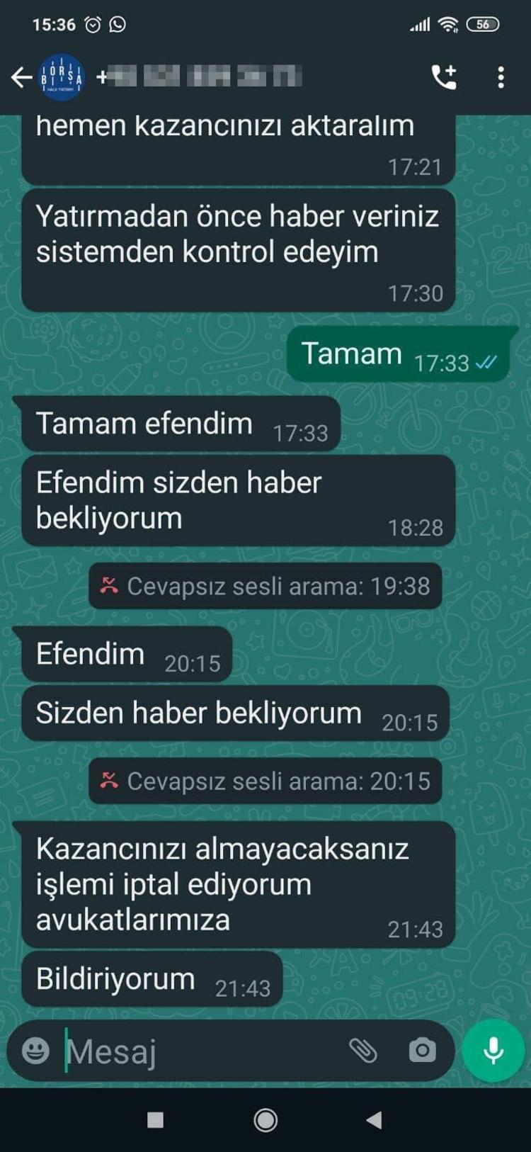 Şüphelilerin bu kez de Avukat Kasırga'nın kimlik bilgilerini kullanıp, internet üzerinden yatırım vaadiyle dolandırıcılık yaptıkları ortaya çıktı. Mağdurlardan biri de Karabağlar'da yaşayan çocuk bakıcısı O.K. oldu. 22 Ocak'ta bir arkadaşının sosyal medya hesabında borsa yatırımıyla ilgili bir paylaşım gören O.K., iddiaya göre, hesabının çalındığından habersiz olduğu arkadaşıyla WhatsApp hesabından yazışıp, kendisinin de yatırım yapmayı düşündüğünü belirterek bilgi istedi. Arkadaşıymış gibi O.K. ile yazışan dolandırıcılar, Forex uygulamasından para kazandıracaklarını, kazandıramamaları durumunda parasını iade edeceklerini söyleyip, hesap numaralarını verdi. İkna olan O.K., verilen hesap numarasına 5 bin TL yatırdı. 3 saat kadar sonra dolandırıcılar, düzenledikleri sahte belgeyle O.K.'ye 98 bin TL kazandığını ancak paradaki blokeyi kaldırmak için 19 bin 750 TL daha yatırması gerektiğini söyledi. O.K., istenen bu parayı da gönderdi. Ancak bir süre sonra 40 bin TL daha istenmesi üzerine O.K., şüphelenip, bu parayı yatırmak istemedi. Bunun üzerine Avukat Ersin Kasırga’nın kimliğini ve fotoğrafını kopyalayan şüpheliler, O.K’yi parayı yatırmaması durumunda hapis cezasıyla cezalandırılacağını söyledi. Durumdan şüphelenen O.K, Kasırga'nın bürosunu arayınca dolandırıldığını anladı. Avukat Kasırga ise dolandırıcıların bu defa yatırım yalanıyla dolandırdıklarını öğrendi.