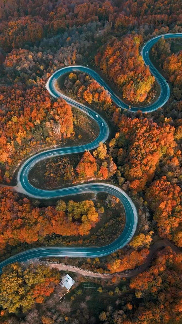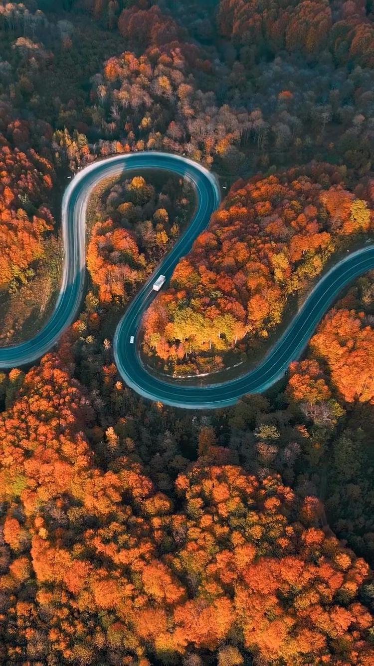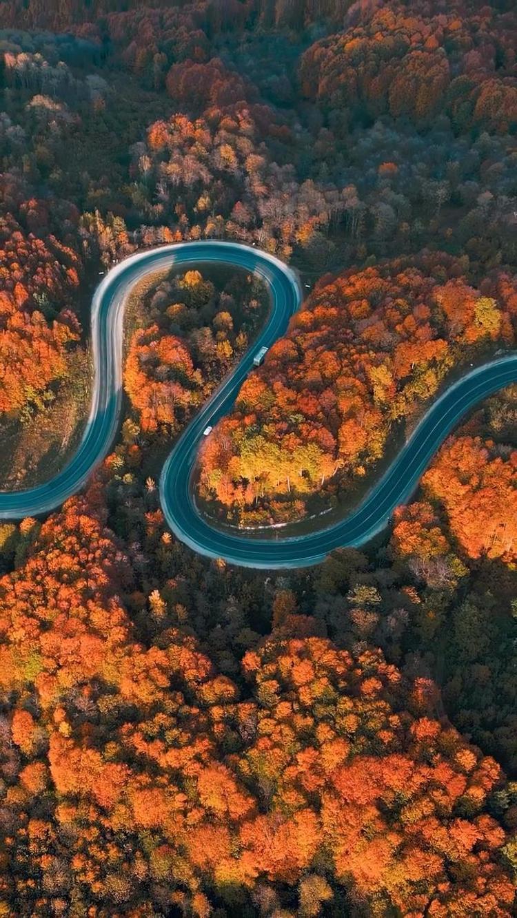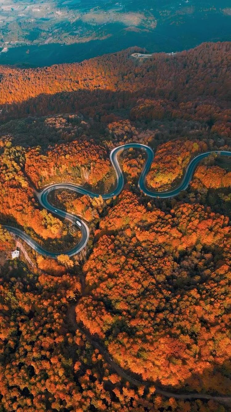 Bursa'nın İnegöl ilçesi ile Kütahya'nın Domaniç ilçelerini birbirine bağlayan 'kıvrımlı yollar', sonbahar renkleriyle sürücülere güzel manzara sunuyor. Çevresindeki ağaçların sarı ve yeşilin tonlarına büründüğü yol, dronla görüntülendi.